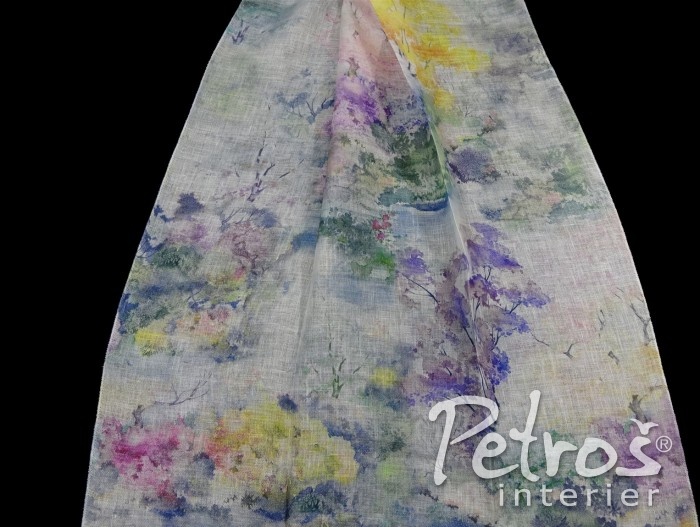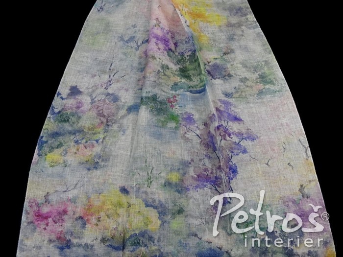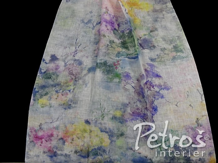 a závěsy. Na přírodním lněném plátně je potisk