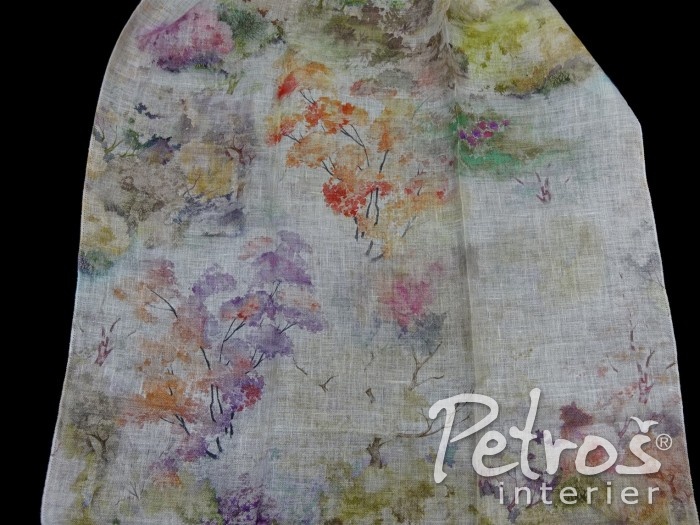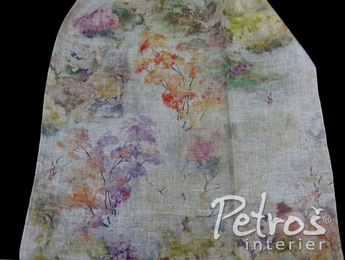 Tato úžasná lněná látka má gramáž 100 g/m2 a je poloprůhledná, řadí se tedy k tzv. In-between, tedy něco mezi záclonamizávěsy. Na přírodním lněném plátně je potisk stromů a rostlin inspirovaný obrazy mistra Van Gogha. Tyto záclony – závěsy si můžete vybrat ve dvou barevných kombinacích – lila (převládají jemné odstíny modré, fialové a starorůžové), nebo orange (převládají jemné odstíny tlumeně oranžové, tlumeně zelené a tlumené béžovohnědé).
