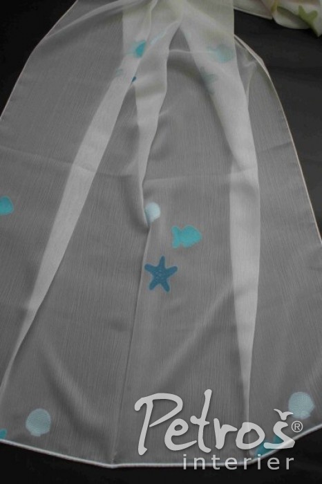 Tyto dětské voálové záclony mají drobný vzorek s motivem mořských živočichů – ryby, hvězdice a mušle. Záclona je bílá a vzorek je v tyrkysové barvě. Záclona je k dostání ve třech výškách.