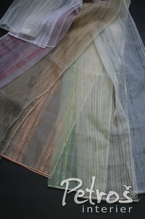 Tyto záclony z organzy mají vzor jemných barevných proužků. Vybrat si je můžete v sedmi barevných variantách. Záclony mají výšku 300 centimetrů.
