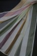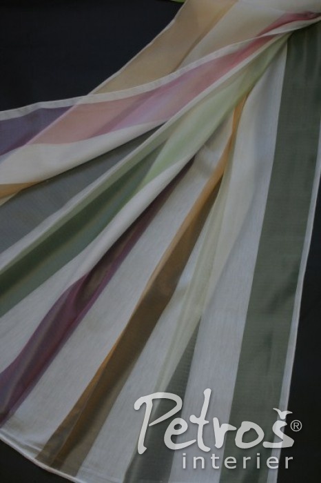 Na záclonách Komet se střídají barevné pruhy z organzy s hustěji tkanými pruhy v přírodně bílé barvě.