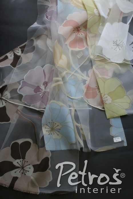 Záclony z organzy L 209132 mají vzor výrazných barevných květů. Tyto záclony si můžete vybrat v sedmi barvách.
