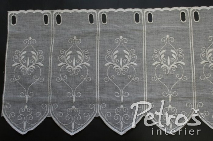 Tyto batistové vitrážkové záclony jsou zdobeny jemnou ornamentální výšivkou. Na výběr jsou ve třech výškách.