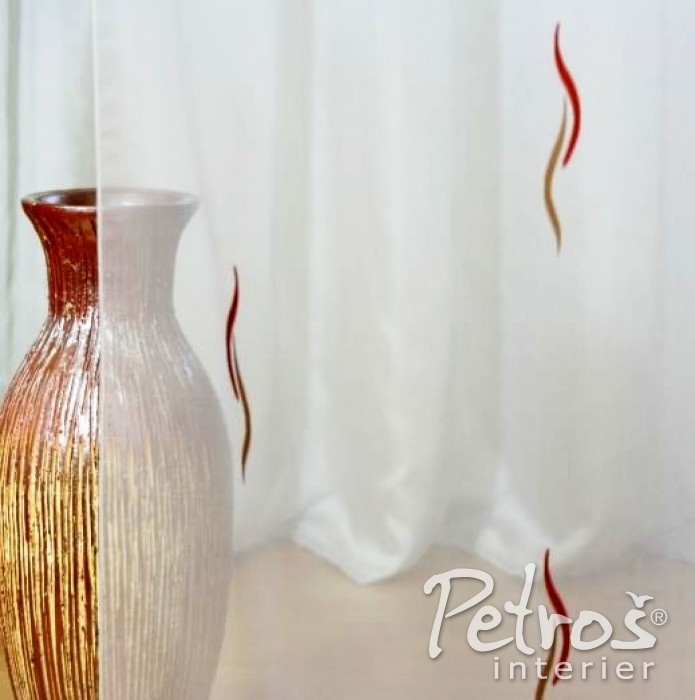 Voálové záclony mají vzor červených a béžových vlnek. Tyto záclony jsou vyrobeny v Německu a nabízíme je v šíři 190, 260 a 300 centimetrů.
