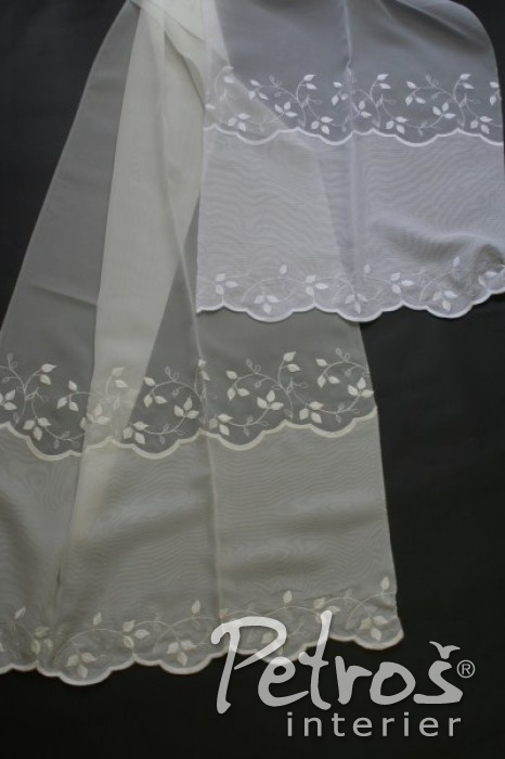 Vyšívané záclony 2016596 si můžete vybrat v bílé a ecru barvě. Na hladkém bílém voálovém podkladu mají tyto záclony jemnou vyšívanou spodní borduru.