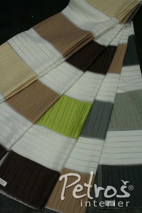 U těchto pruhovaných závěsů se střídají crashované pruhy s hladkými. Závěsy si můžete vybrat v pěti barevných variantách. U barvy 04 (hnědo–bílo-šedá) je vertikální raport 55 cm, u ostatních je raport 59 cm.
