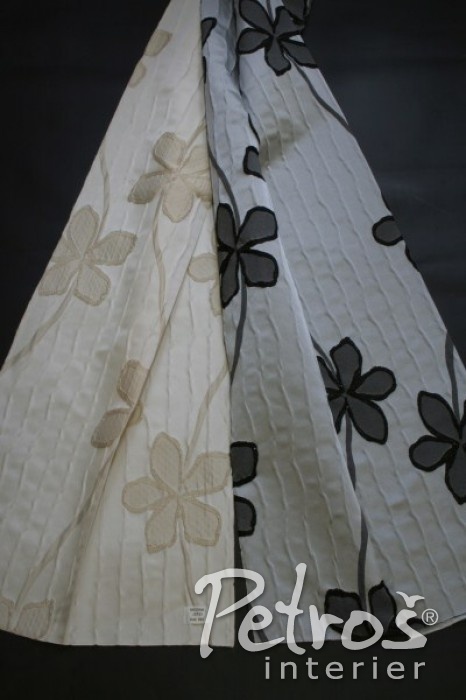 Svisle crashované závěsy Regina mají výrazný květinový vzor. Závěsy si můžete vybrat ve dvou barevných variantách s béžovými a tmavě hnědými květy.