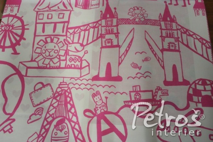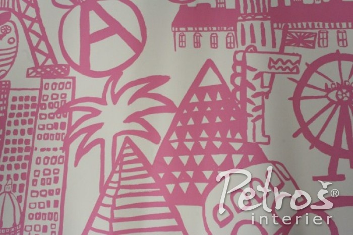 Růžovobílé bavlněné dětské závěsy Destination – Fuchsia lze nakombinovat s tapetou na zeď Panorama Fuchsia ve stejných barevných odstínech.