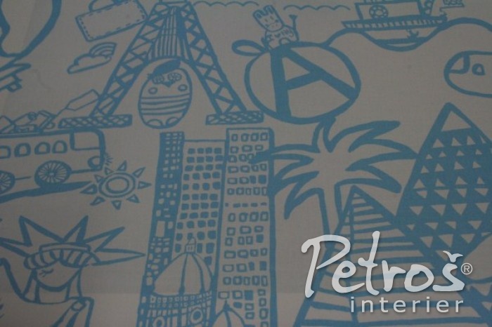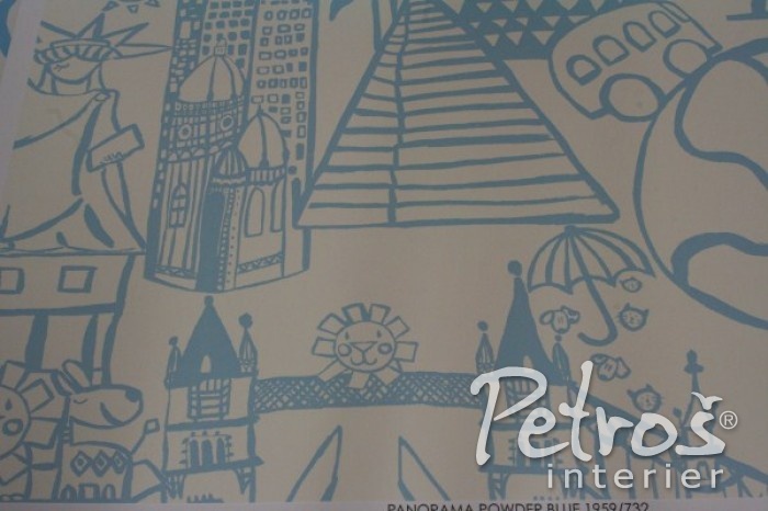 Dětské bavlněné závěsy Destination – Powder Blue můžete zkombinovat s tapetou na zeď Panorama Powder Blue.