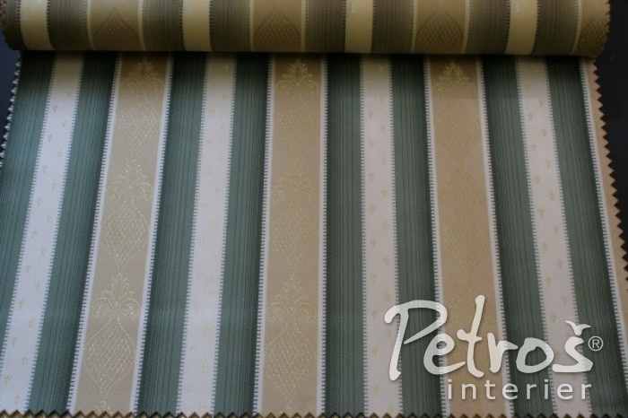 Tyto nehořlavé závěsy Princess mají klasický vzor uspořádaný do pruhů v kombinaci barev béžovo-zlaté a tlumeně tmavě zelené.