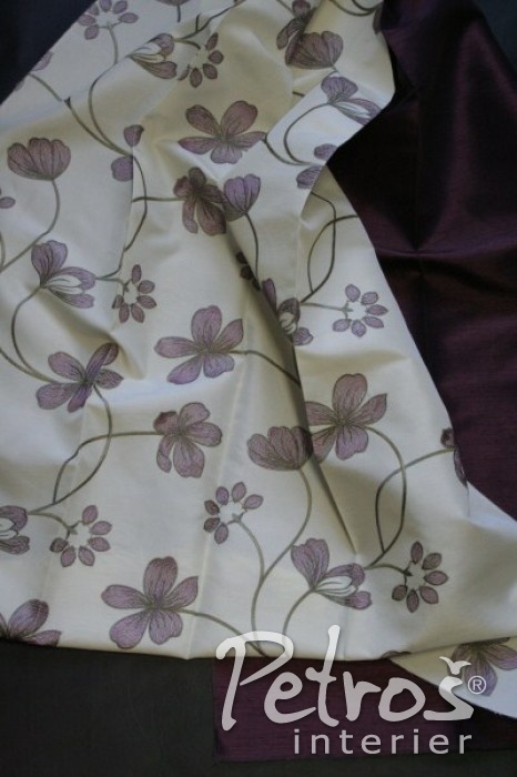 Tyto jemné romantické květované závěsy v růžovofialových tónech je možné zkombinovat s barevně sladěnými jednobarevnými závěsy.