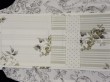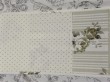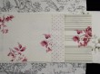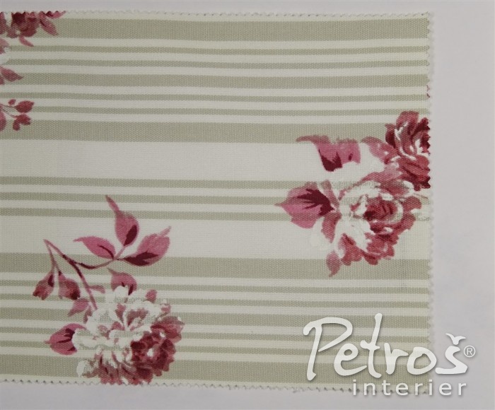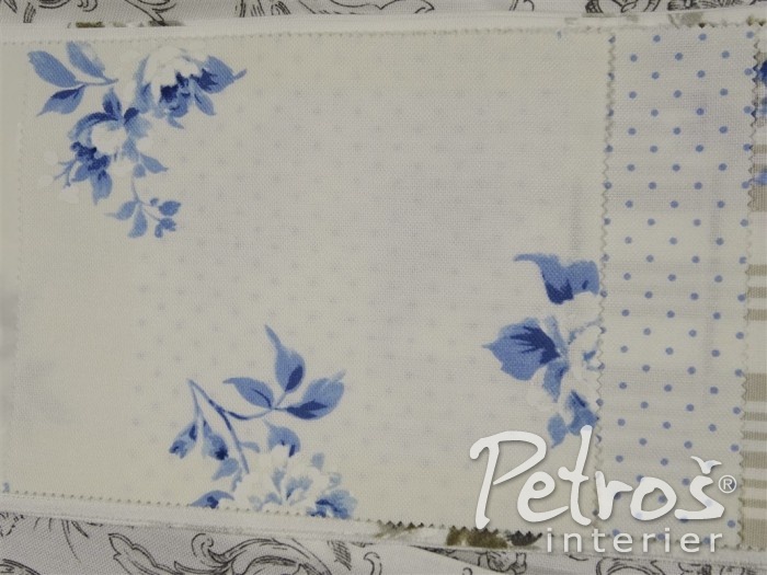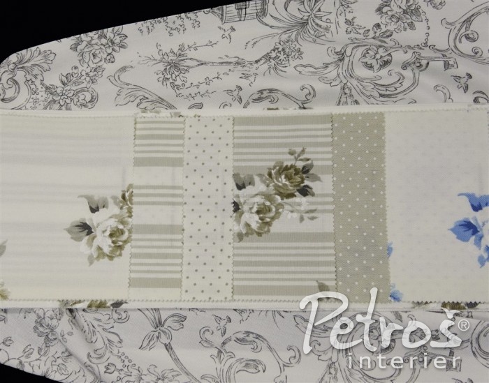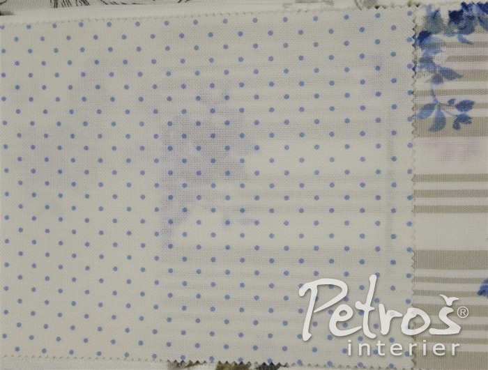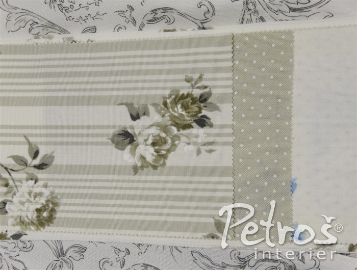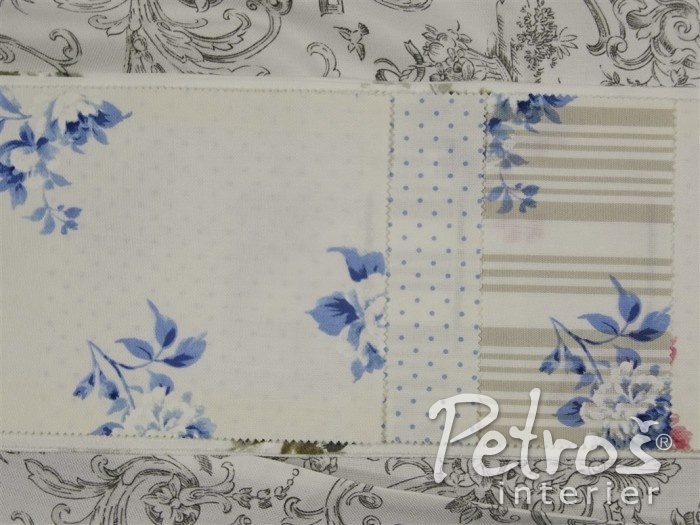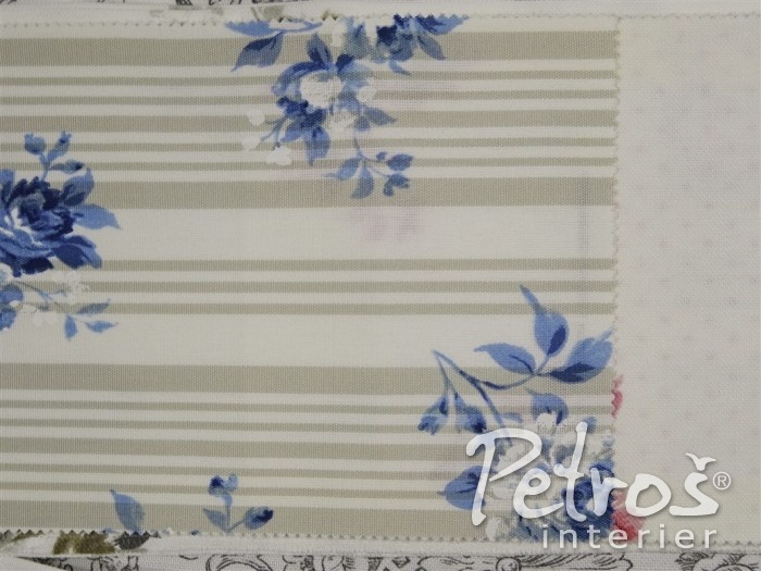 Kolekce závěsů Avignon kombinuje vzor květů, proužků a drobných puntíků v béžové, bledě modré a starorůžové barvě, vždy na přírodně bílém podkladu.