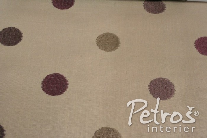 Závěsy Fez Ametyst mají vyšívané barevné puntíky laděné do béžové a fialové barvy na podkladu v přírodním stylu ze směsi polyesteru a přírodních vláken. Tato látka se hodí na závěsy a skvěle se dá využít například i na dekorační polštáře.