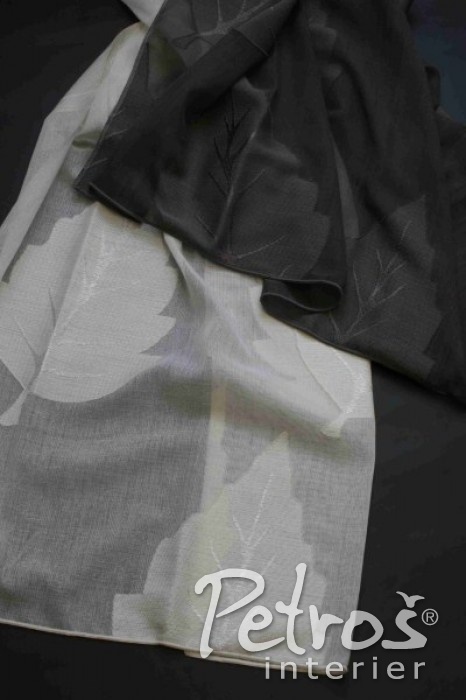 Lehké poloprůhledné romantické závěsy (In between) Nervio v přírodním stylu se dají použít i jako hustější záclony. Tyto závěsy jsou zdobeny motivem velkých listů a jsou vyrobeny v přírodně bílé a tmavě hnědé barvě.