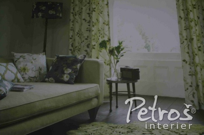 Vzorované závěsy Melrose 405943 – Willow 629 lze kombinovat i s jednobarevnými závěsy Panama Lichen 613, Avocado 637, Black 900.